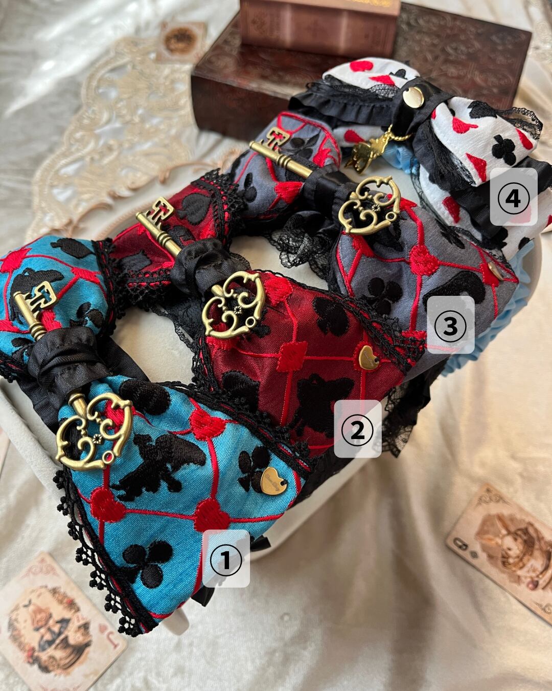 ④のみカチューシャ部分はリボンにギャザーを寄せてあるので、ギャザーの寄せ具合によっておリボンの位置を多少変えられます。センターでも少しサイドにしても、気分や装いによって位置を変えて楽しんでください。