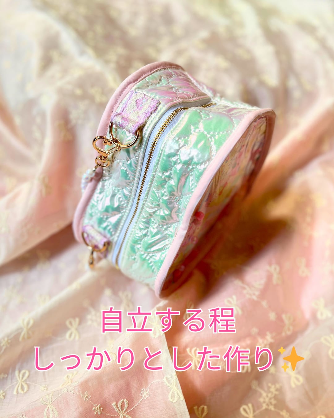 持ち手にはパールのバッグチャームを。